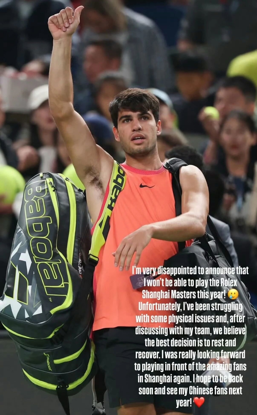 刚刚,阿尔卡拉斯通过个人社交媒体宣布退出2025上海网球大师赛。